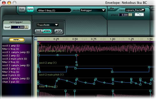 Modulo Waveshaping: utilizza un oscillatore per indurre una distorsione non lineare al segnale, molto sensibile all?ampiezza del segnale in ingresso ed al parametro phase. Capace di generare distorsioni veramente aggressive. Vorrei rimarcare la duttilità e potenza del Generatore d?Inviluppo. Siamo ben lontani dal concetto tradizionale di ADSR, adesso ci troviamo davanti a ben 68 segmenti (breakpoint). L?uso di così tanti punti consente l?utilizzo a mo? di groove dell? EG, opzione che ha molto più senso solo da quando è possibile sincronizzarlo velocemente ai bpm di un progetto. Già nella prima versione ci si era resi conto dell?estrema utilità di un EG così raffinato ma, le ulteriori aggiunte della v. 2, hanno reso questo stadio estremamente potente. Adesso si possono linkare più EG consentendone l?editing contemporaneo, cosa estremamente utile nel caso di cambiamenti di groove. Si può governare, in tempo reale tramite qualunque controller, livelli e/o tempi dei segmenti in maniera individuale (Control Driven Mode). In modalità Sample (non granular) abbiamo disponibilità per un EG ancor più particolare: il Sample Jump. In questo caso è visibile la forma d?onda del campione alla quale si sovrappongono, invece dei breakpoint, dei markers che permetto di ritriggerare delle sezioni del campione e sincronizzarle al tempo del brano.