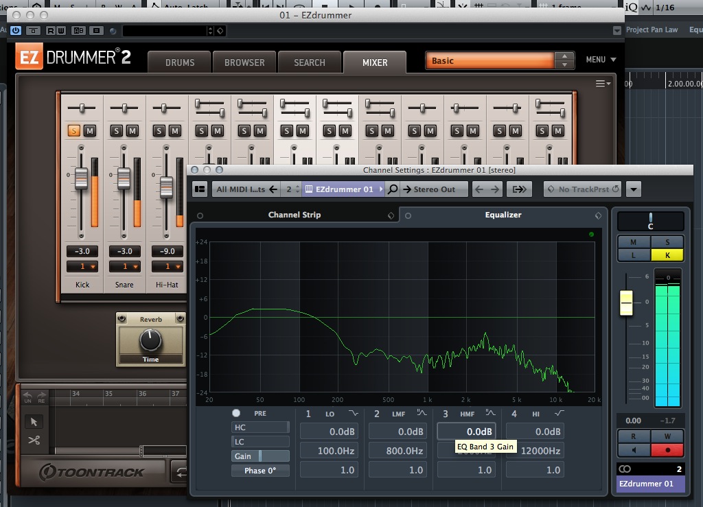 A complicare le cose c’è anche il fatto che ogni suono è composto da una miscela di frequenze audio che parte da una “fondamentale” arricchita da quelle che vengono chiamate frequenze “armoniche” o “parziali”. Quando quindi il suono di grancassa fissato sui 50/60Hz è particolarmente brillante è perchè le sue armoniche arriveranno a 4000 o 5000Hz, se non 8000. Basta prendere un qualsiasi preset di batteria virtuale e far suonare una cassa, usando un analizzatore di spettro per verificarlo.