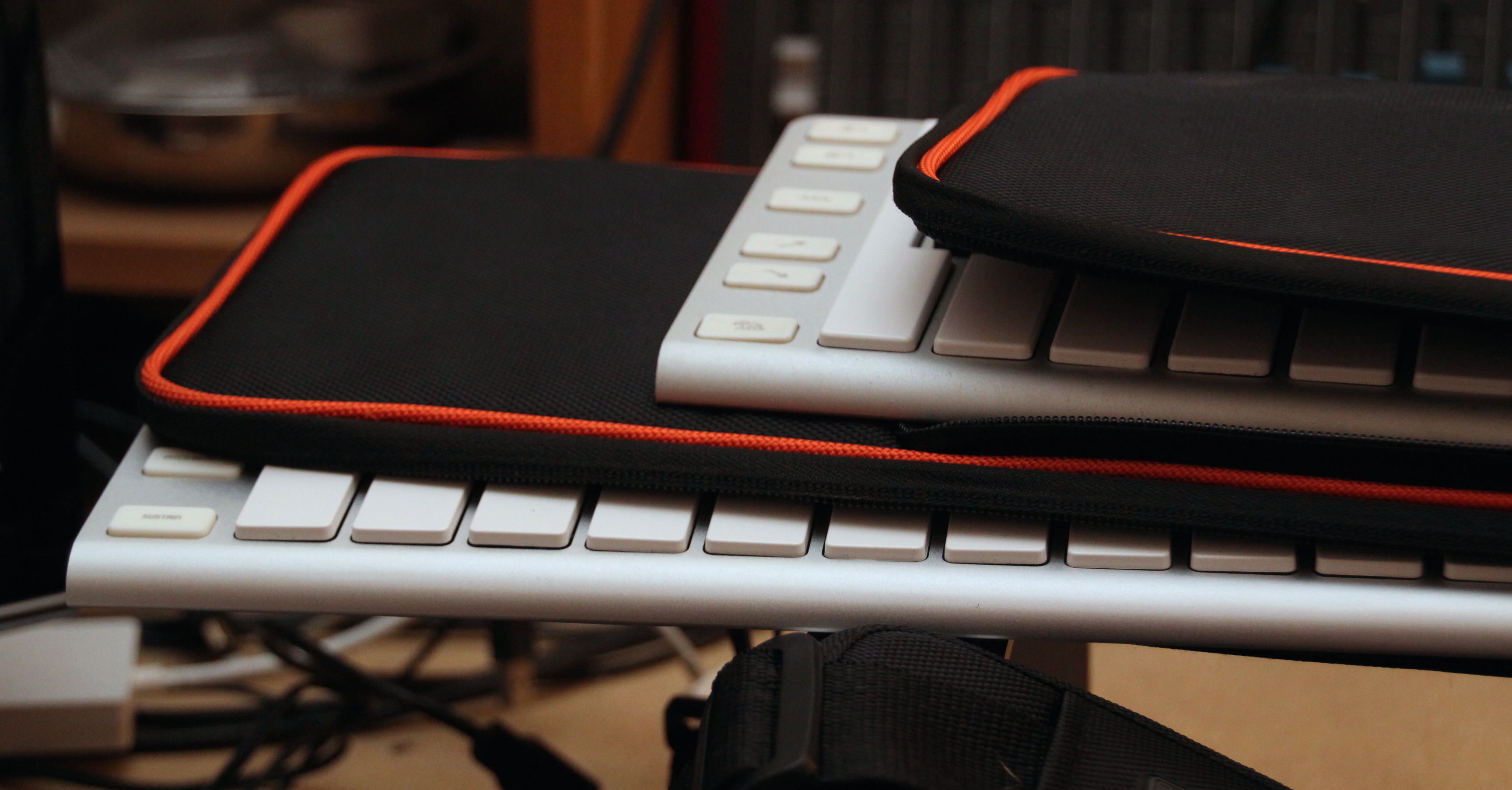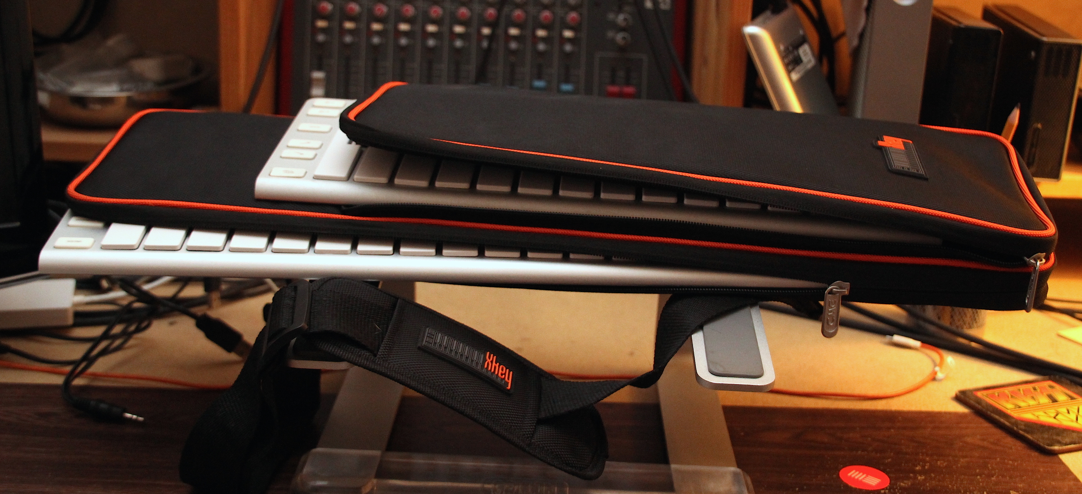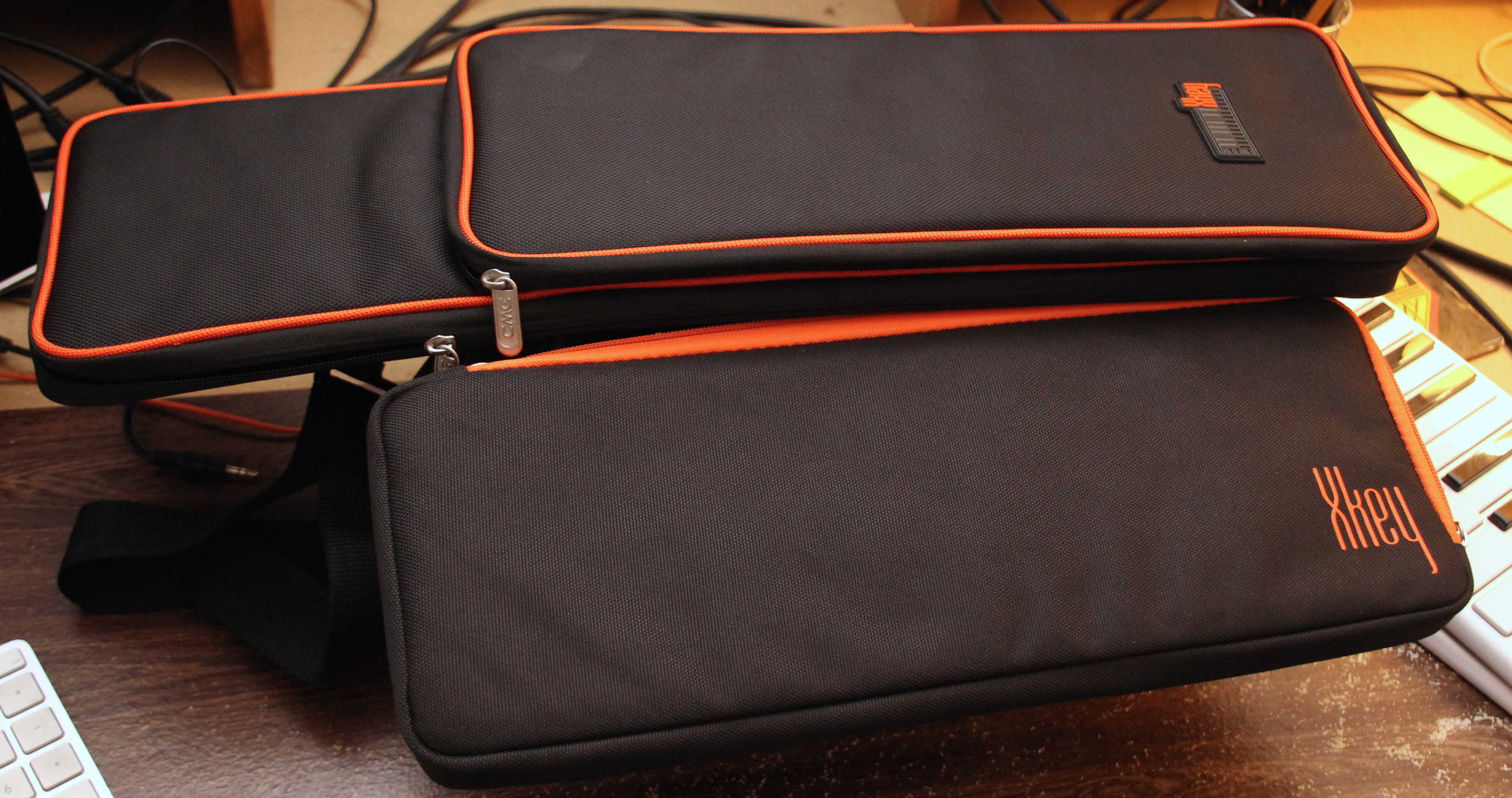 Per trasportare i 2 prodotti, CME offre delle custodie su misura per entrambi i modelli. La custodia per la Xkey 25 (Supernova) è una borsetta su misura adatta a proteggere il prodotto durante i viaggi così come quella per la Xkey 37 (Solar Xkey37), che però include una tracolla e ha un comparto aggiuntivo che può ospitare comodamente anche una Xkey 25, come potete vedere dalle immagini. Questo ovviamente è utile a chi avesse entrambe le tastiere, una idea da considerare dato che si avrebbero così 62 tasti (con un DO in comune) e decisamente una ampia portabilità.