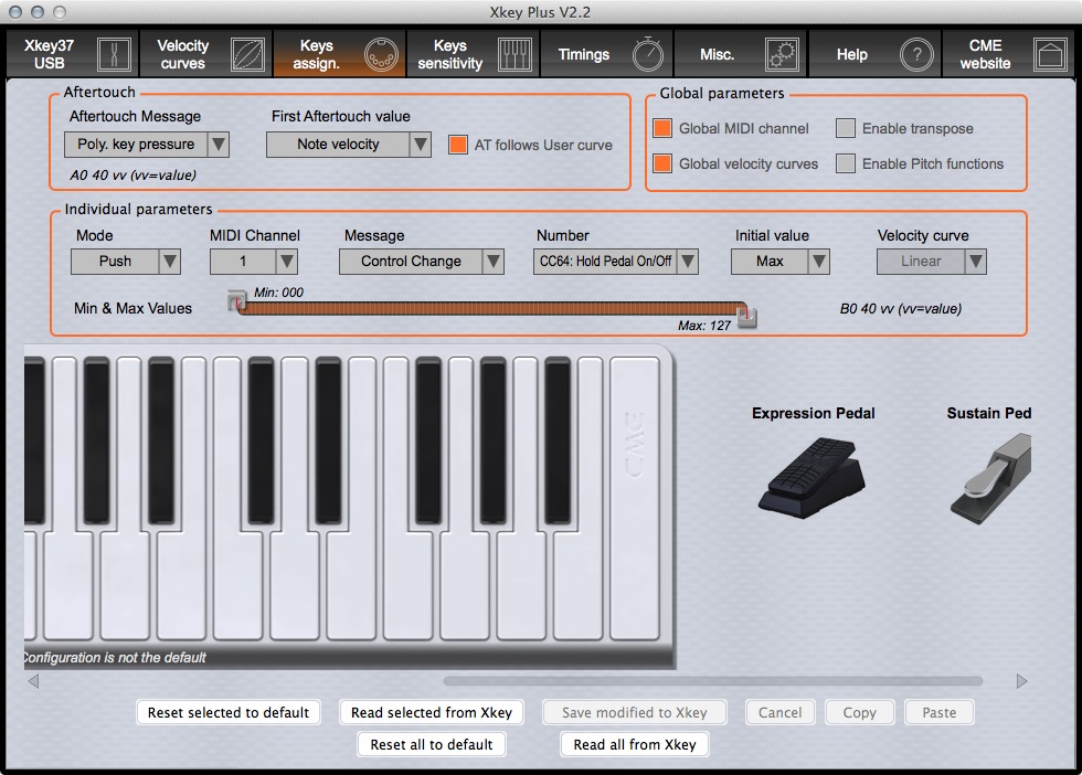 Le applicazioni consigliate sono innanzitutto quelle create ad hoc da CME e che si possono trovare a partire da http://www.cme-pro.com/xkey-downloads/. La prima è la app di configurazione Xkey Plus disponibile per iPad, OSX e Windows con la quale è possibile aggiornare il firmware e accedere alla personalizzazione di tutti i parametri importanti come la curva di risposta alla velocity (la pressione del tasto) e l’aftertouch (quanto viene ulteriormente premuto il tasto dopo la pressione iniziale). Un plauso in questo senso allo sviluppatore perchè c’è la possibilità di personalizzare ciascun tasto in maniera approfondita come è possibile comprendere dall’immagine: è addirittura possibile assegnare funzioni diverse a ciascun tasto!ù